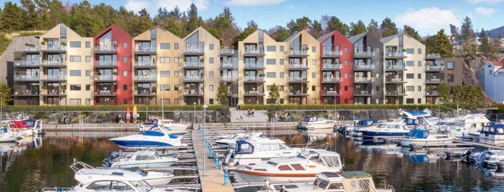 Boligprosjekt over 5 etasjer med 50 leiligheter bygget på nedgravd parkeringskjeller.