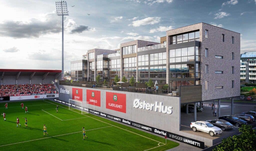 Kombinert forretning – og boligbygg over 5 etasjer ved Bryne Stadion.